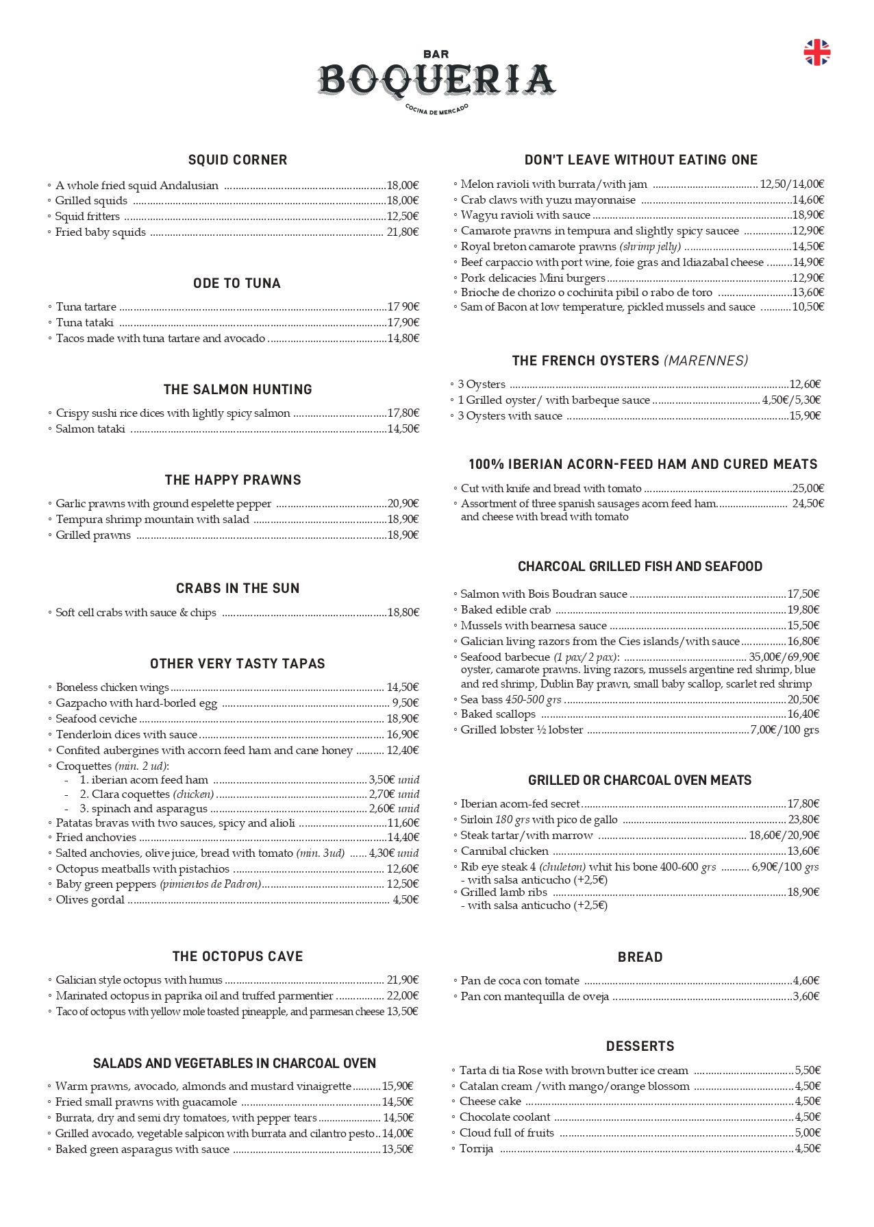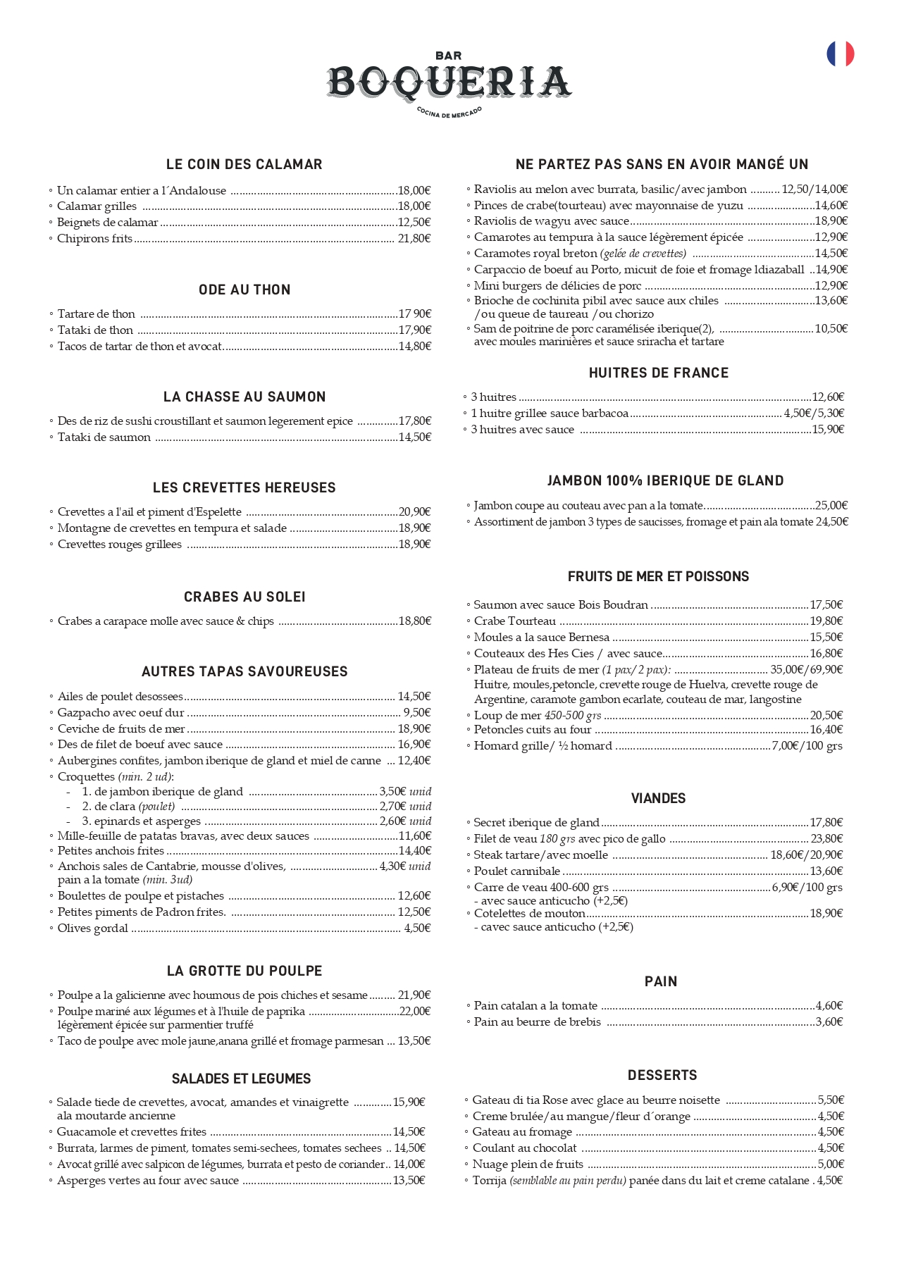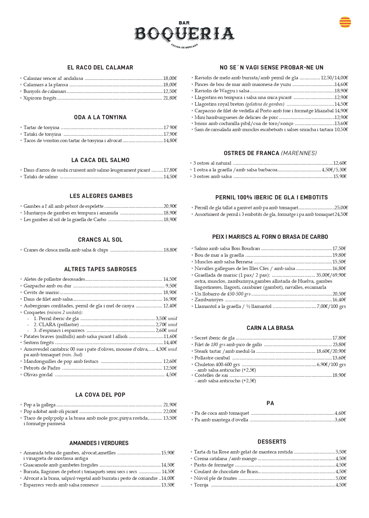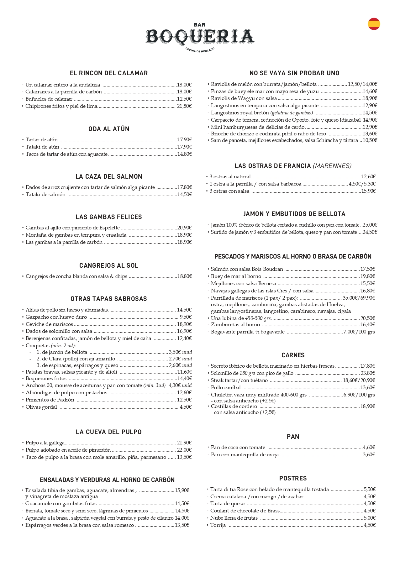 Con 23 años de andadura BAR BOQUERIA es un clásico, nuestra cocina es una mezcla del recetario catalán y de la gastronomía española: desde unas espinacas a la catalana pasando por un pulpo a la gallega o un rabo de res andaluz.